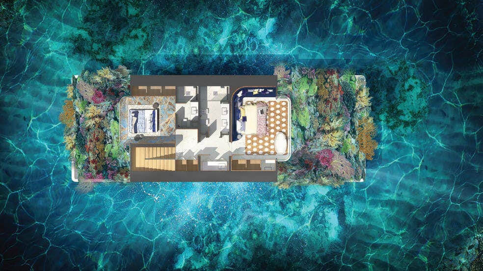 این ویلاها غرق در دریا هستند، سطح زیر آب آنها دارای یک یا دو اتاق خواب اصلی بسته به نسخه ویلا است. هر اتاق خواب اصلی دارای یک حمام و یک پنجره مسقف به طبقهای با منظره فوق العاده زیبای دریا است. هر حمام نیز دارای یک پنجره در نزدیکی وان است که هر بار که در آن دوش بگیرید، یک حس لذت و شادابی را تجربه میکنید.